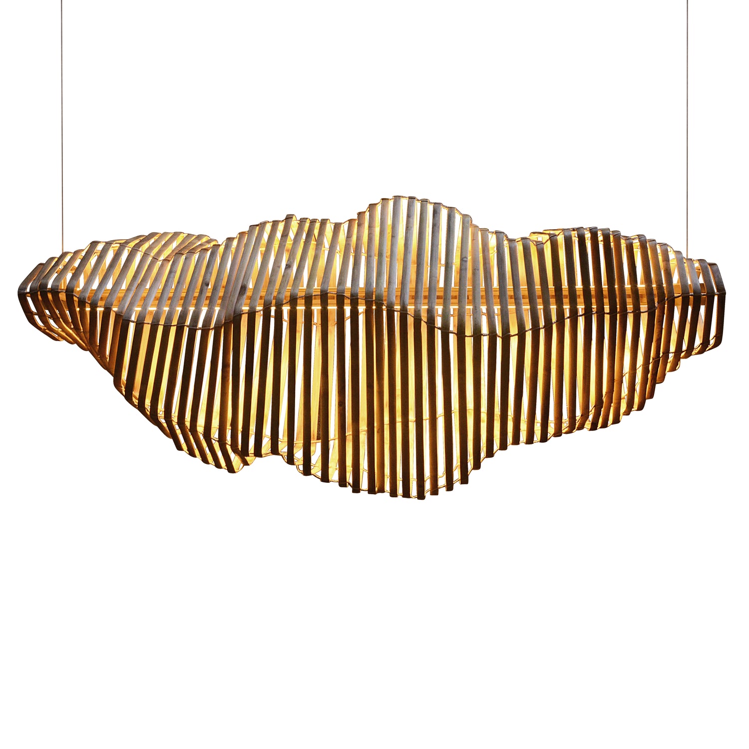 Each piece of pendant lighting in this collection is crafted from hand-bent bamboo slats. The collection is our tongue-in-cheek comment on parametric design because each of these pendants was designed by hand, and without any kind of software. We relied on geometry, light and bamboo’s beauty and versatility to develop these products in our usual old-school hands-on format. The bamboo pendant lamps look gorgeous as individual units or together, as part of a larger lighting installation. The required bulbs, wire and base plate are included with each lighting unit. Each lighting moves organically, throwing stunning shadows on the interior elements. Each unit can be fixed in place using a metal tube on request. Larger lighting installations can be created and installed on request.