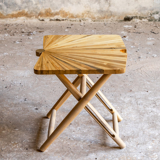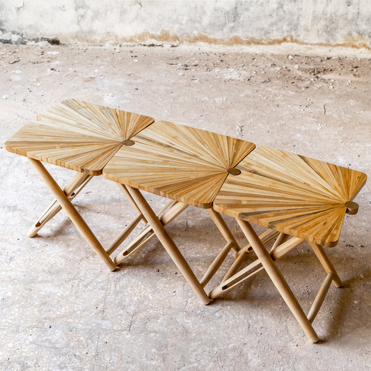 The Fan collection comprises individuals’ stools, which work well alone and interlock with other fan stools to create a larger seating/low table/bench surface. The top of each stool is made from painstakingly hand-laminated bamboo laid out in an elegant fan-palm inspired pattern. This is a multifunctional, space saving and modular design.