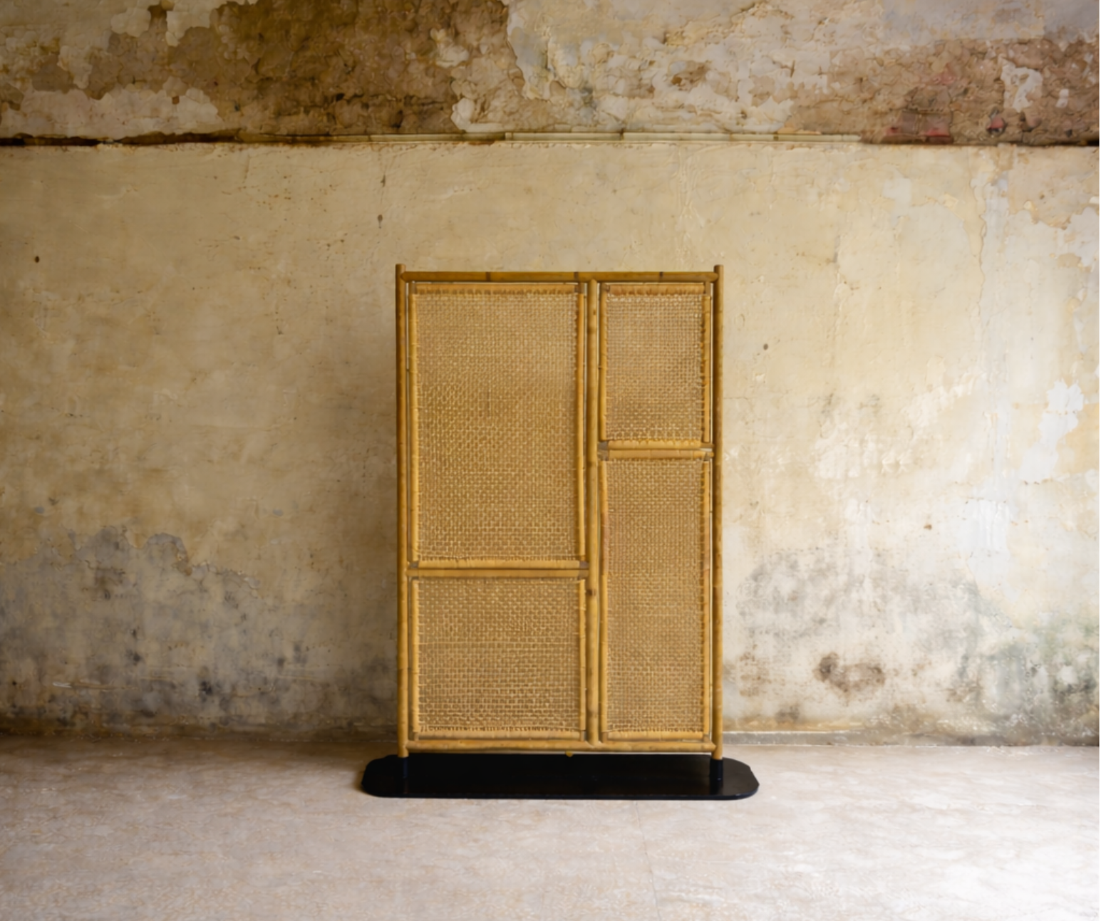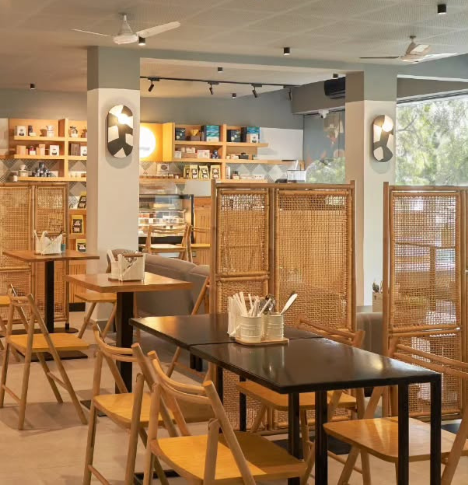 The screens are composed of a heavy metal base for stability, a bamboo framework, and hand-woven panels in upcycled polyester silk rope. They are designed to gently define zones within the café without creating rigid separations. Filtering light and views, the screens introduce moments of privacy while maintaining airiness, allowing the space to feel intimate yet expansive.